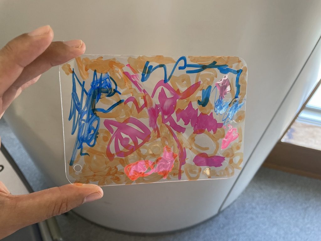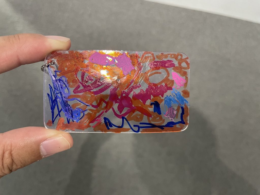 自分で絵を書いて、自分だけのオリジナルキーホルダーが作成できました。
